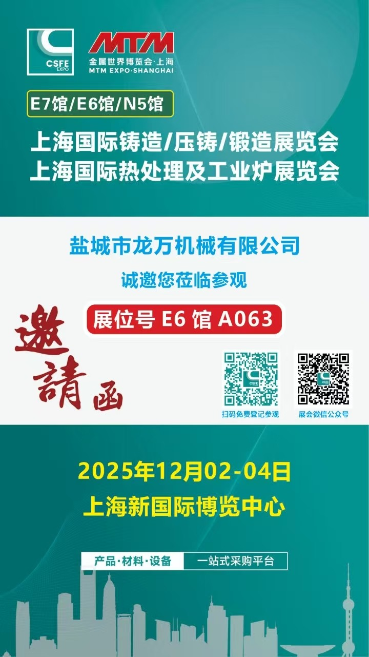 Yancheng Longwan Machinery Co., Ltd. akan berpartisipasi dalam “Pameran Baja/Die Casting/Pengecoran Internasional Shanghai” dan “Pameran Tungku Industri dan Perlakuan Panas Internasional Shanghai” yang diadakan di Pusat Pameran Internasional Shanghai dari tanggal 2 hingga 4 Desember 2025. Pameran ini menarik banyak perusahaan terkemuka dari industri baja, pengecoran, dan perlakuan panas. Yancheng Longwan Machinery Co., Ltd. akan menggunakan platform ini untuk memamerkan teknologi terbaru dan produk inovatifnya di bidang manufaktur mesin.